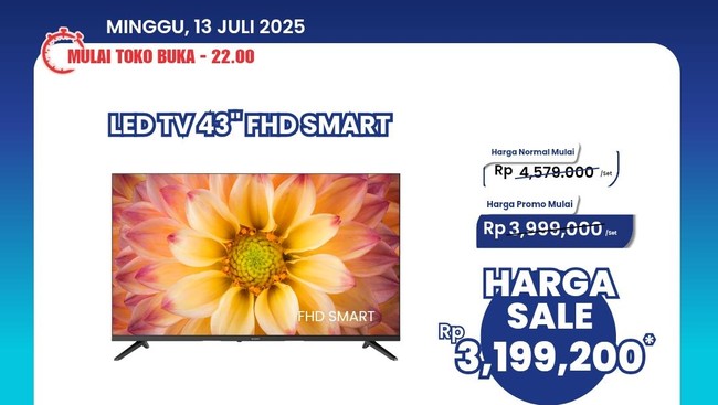 TV LED FHD Smart ukuran 43 inch berbagai merek dibanderol mulai dengan harga Rp 3.999.000 dari harga normal Rp 4.579.000. Pelanggan setia Transmart bisa mendapatkan harga lebih murah lagi jika bertransaksi menggunakan Allo Prime, Kartu Kredit Bank Mega atau Bank Mega Syariah, harganya menjadi Rp 3.199.200. Artinya pelanggan hemat hingga Rp 1,3 jutaan dari harga normal.