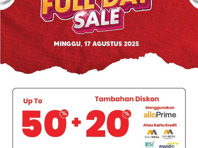Selain diskon hingga 50%, diskon tambahan 20% diberikan kepada pelanggan apabila bertransaksi menggunakan Allo Prime, Allo Paylater, kartu kredit Bank Mega, atau kartu kredit Bank Mega Syariah.