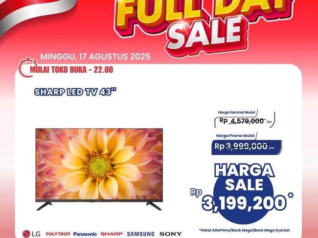 Transmart kembali menggelar program belanja hemat Full Day Sale pada Minggu, 17 Agustus 2025. Mulai toko buka hingga pukul 22.00 WIB, pelanggan bisa menikmati diskon besar-besaran untuk berbagai produk elektronik pilihan, salah satunya TV SHARP LED 43 inci.