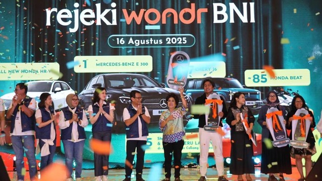 PT Bank Negara Indonesia (Persero) Tbk (BNI) resmi membagikan hadiah kepada pemenang tahap pertama program undian Rejeki wondr BNI, yang digelar di sela acara BNI wondrX 2025 di ICE BSD, Tangerang, hari ini. Adapun hadiah yang dibagikan berupa mobil mewah hingga smartphone.