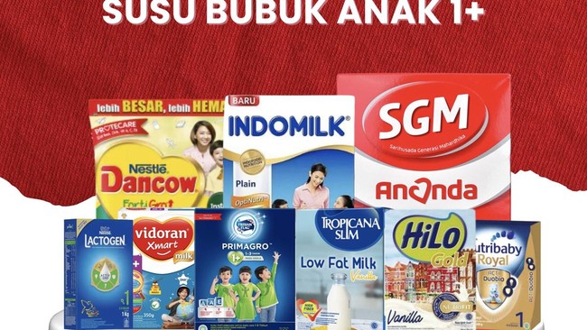 Merek susu bubuk anak yang mendapat diskon 10% antara lain Hilo, Lactogen, Primagro, Dancow, Tropicana Slim, Hilo Gold, Nutribaby Royal, SGM, Indomilk, hingga Vidoran Xmart.