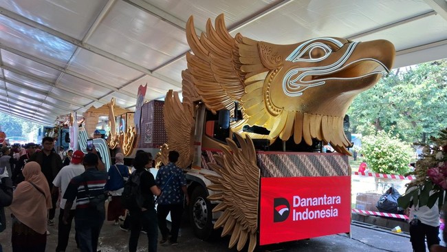 Berdasarkan lawatan detikcom di kawasan Monas, Jakarta, terparkir mobil karnaval milik Danantara. Kendaraan tersebut dihiasi sejumlah ornamen sarat nilai filosofi dan identik dengan Nusantara. Salah satunya, terdapat miniatur kepala Garuda Emas tepat di bagian depan kendaraan karnaval.