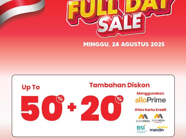 Selain diskon hingga 50%, diskon tambahan 20% diberikan kepada pelanggan apabila bertransaksi menggunakan Allo Prime, Allo Paylater, kartu kredit Bank Mega, atau kartu kredit Bank Mega Syariah.