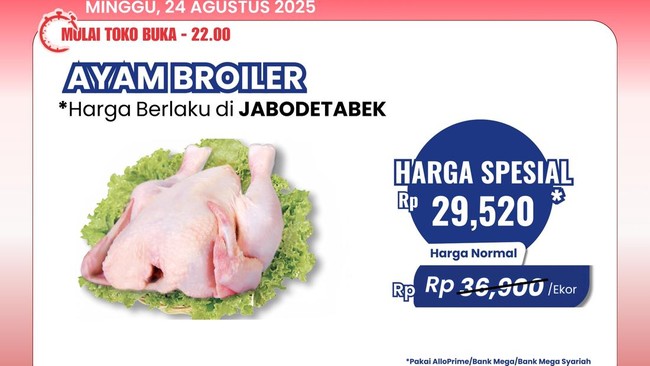Spesial hari ini, ayam broiler mendapatkan harga promo. Khusus di Jabodetabek, ayam broiler diobral cuma Rp 29.520/ekor dari harga normal Rp 36.900/ekor. Harga itu bisa didapatkan jika melakukan pembayaran menggunakan Allo Prime, kartu kredit Bank Mega atau Bank Mega Syariah.