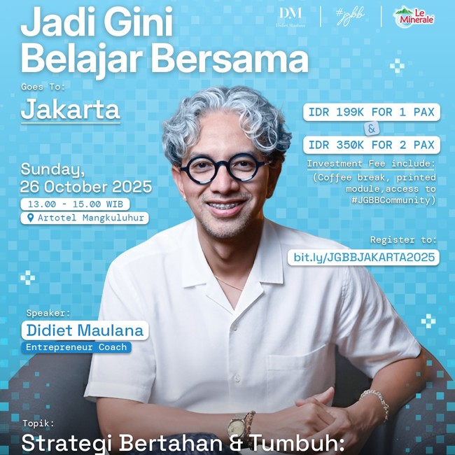 "Aku akan sharing tentang bagaimana membangun brand dan menyusun strategi marketing, pentingnya personal branding untuk business owner, hingga step by step membangunnya dengan teman-teman UMKM di Jakarta. Nggak cuma itu, aku juga akan membuka kesempatan untuk JGBBCommunity Jakarta mempromosikan produk di depan kelas nanti," ujar Didiet dikutip dari akun Instagram @didietmaulana, Senin (29/9/2025).