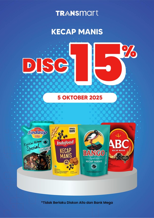 Pekan ini, ada Sedaap Kecap Manis Special, Indofood Kecap Manis, Bango Kecap Manis, dan ABC Kecap Manis yang diskon 15% pada 5 Oktober 2025.