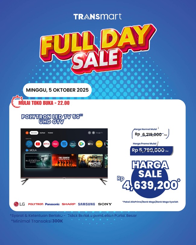 Transmart Full Day Sale hadir di seluruh gerai Transmart di Indonesia. Selama gelaran tersebut, ada diskon hingga 50+20% untuk berbagai produk, termasuk produk LED TV dari berbagai merek.