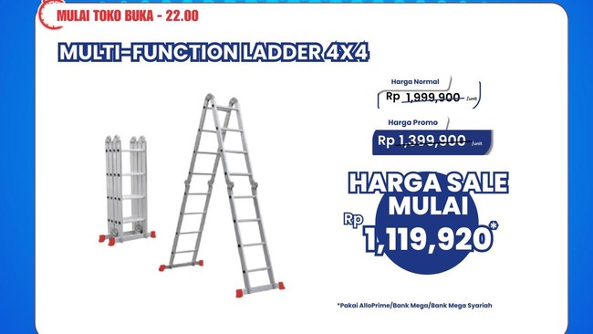 Salah satu produk diskon adalah tangga multifungsi. Khusus hari ini, multifunction ladder 4x4, harganya ditawarkan Rp 1.399.900/unit. Padahal harga normal Rp 1.999.900/unit.