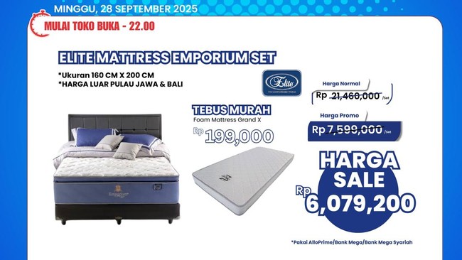 Harga tempat tidur pun bisa lebih murah lagi jika pelanggan setia menggunakan kartu kredit Bank Mega atau Bank Mega Syariah, Allo Prime, dan Allo Prime, harganya menjadi Rp 6.319.200. Artinya, pembeli bisa hemat sampai Rp 13 jutaan.