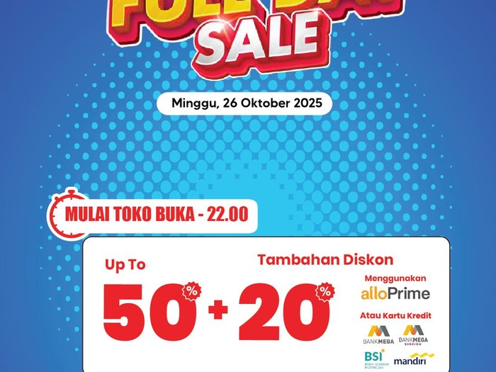 Selain diskon hingga 50%, diskon tambahan 20% diberikan kepada pelanggan apabila bertransaksi menggunakan Allo Prime, Allo Paylater, kartu kredit Bank Mega, atau kartu kredit Bank Mega Syariah.