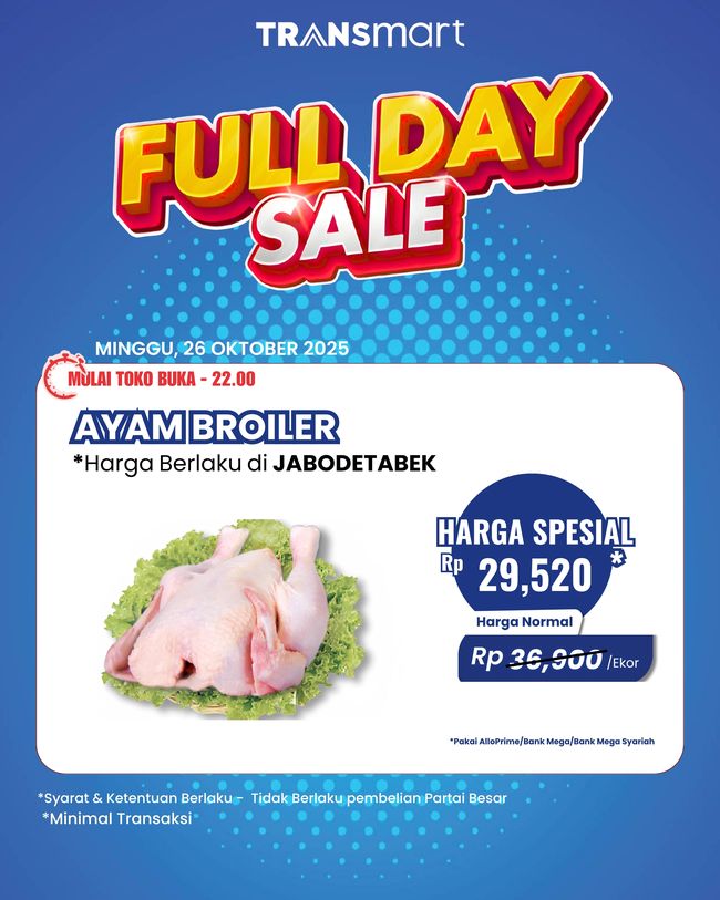 Transmart Full Day Sale akan kembali hadir dengan pesta diskon besar-besaran. Berkat itu pelanggan dapat membeli berbagai macam produk berkualitas dengan harga murah meriah, termasuk untuk ayam broiler.