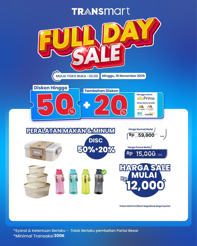 Jika sudah begitu, diskon hingga 50% + 20% siap menanti. Segera merapat ke Transmart terdekat, lalu nikmati diskon melimpah khusus di Transmart Full Day Sale hari ini.