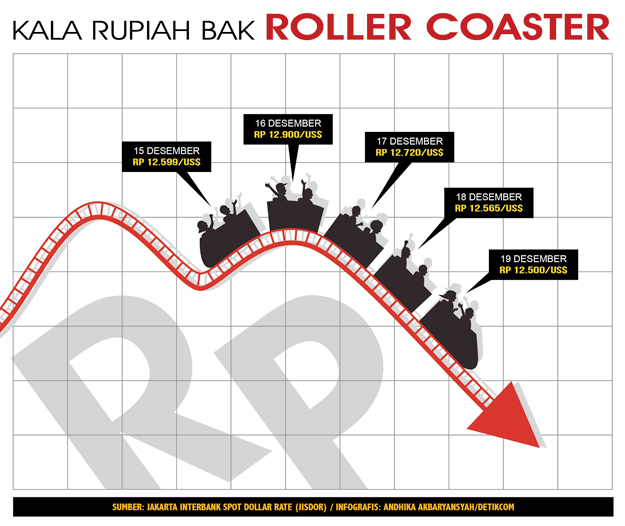 Dalam beberapa waktu terakhir, pergerakan rupiah bisa dikatakan bak permainan roller coaster. Pekan lalu, dolar AS sempat menguat tajam hingga hampir menyentuh batas psikologis Rp 13.000. Ini merupakan yang tertinggi sejak Agustus 1998.