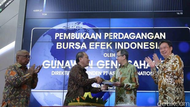 Direktur Independen PTAstraInternationalTbk (ASII) GunawanGeniusahardja dan Direktur PTAstraInternationalTbkSuparnoDjasmin didampingi para eksekutif GrupAstra membuka perdagangan saham di Bursa Efek Indonesia (BEI) dalam rangka peringatan HUT pencatatan saham ke-26 tahun sahamASII.