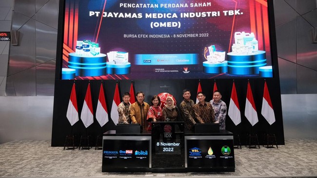 PT Jayamas Medica Industri (OMED) Tbk atau yang lebih dikenal OneMed resmi melantai di Bursa Efek Indonesia (BEI) pada Selasa (8/11). OneMed meraih dana Rp 828 miliar.