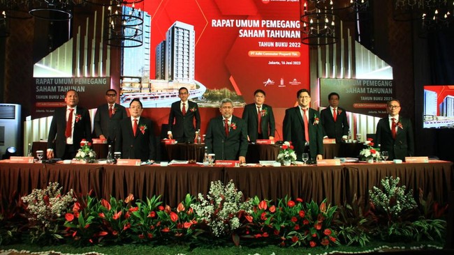 "Pada hari ini Jumat tanggal 16 Juni 2023, PT Adhi Commuter Properti selesai mengelar RUPS tahun buku 2022. Melalui RUPS dalam mata acara rapat diajukan perubahan direksi maupun komisaris," kata Direktur Utama ADCP Rizkan Firman, dalam dalam konferensi pers Rapat Umum Pemegang Saham (RUPS) Tahunan 2022 secara virtual, Jumat (16/6/2023).