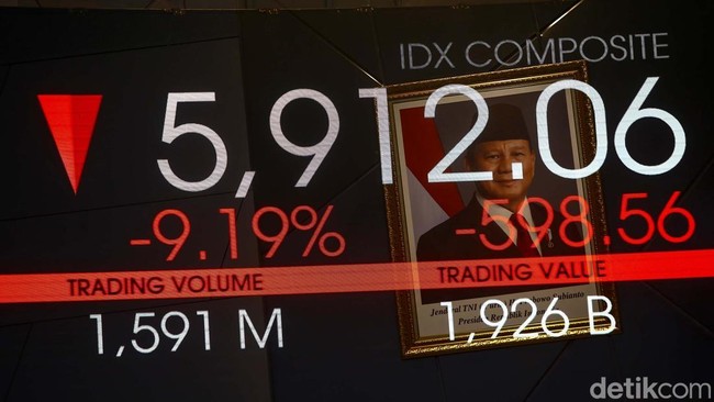 Dikutip dari RTI Business, Selasa (8/4/2025), IHSG pada penutupan terkoreksi sebesar 514,47 poin ke level 5.996 atau melemah 7,90%. IHSG hari ini dibuka pada level 5.914. IHSG mencapai titik tertinggi di level 6.036 dan terendah di 5.882