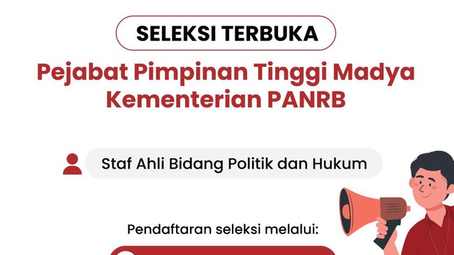 Kementerian Pendayagunaan Aparatur Negara dan Reformasi Birokrasi (PANRB) tengah menggelar seleksi terbuka untuk mencari calon pejabat pimpinan tinggi (PPT) madya. Adapun jabatan yang sedang dilelang dalam kesempatan ini adalah jabatan Staf Ahli Menteri PANRB Bidang Politik dan Hukum.