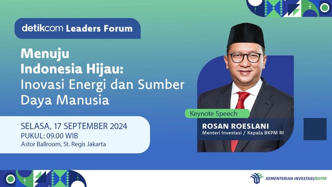 Akan hadir Menteri Investasi/Kepala BKPM Rosan Roeslani yang memberikan keynote speech. detikcom Leaders Forum kali ini akan diselenggarakan di Astor Ballroom, St. Regis Jakarta pukul 9.00 WIB.