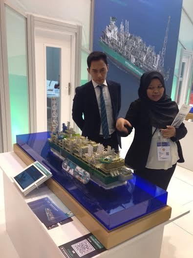 BUMN migas asal Malaysia, yaitu Petronas, memamerkan miniatur kapal bernama Petronas Floating LNG (PFLNG) yang besar.
