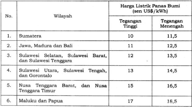 Tabel Harga Listrik Panas Bumi |