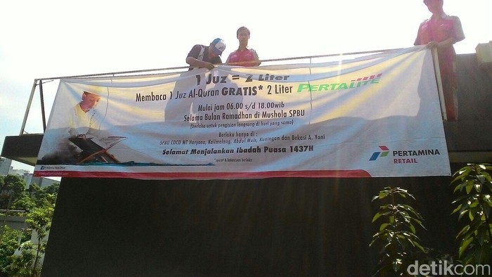 Spanduk program tersebut mulai dipasang hari ini. Berdasarkan pantauan detikFinance di SPBU 31.102.02 Abdul Muis, terpampang spanduk program 1 Juz=2 Liter Pertalite sejak pukul 11.00 WIB.