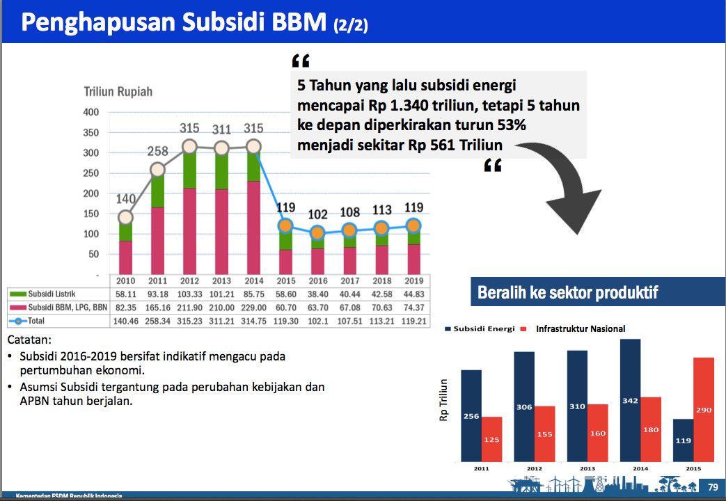 Subsidi energi yang selama 2010-2014 mencapai Rp 1.340 triliun kini bisa dipangkas menjadi kira-kira Rp 561 triliun untuk 2015-2019.