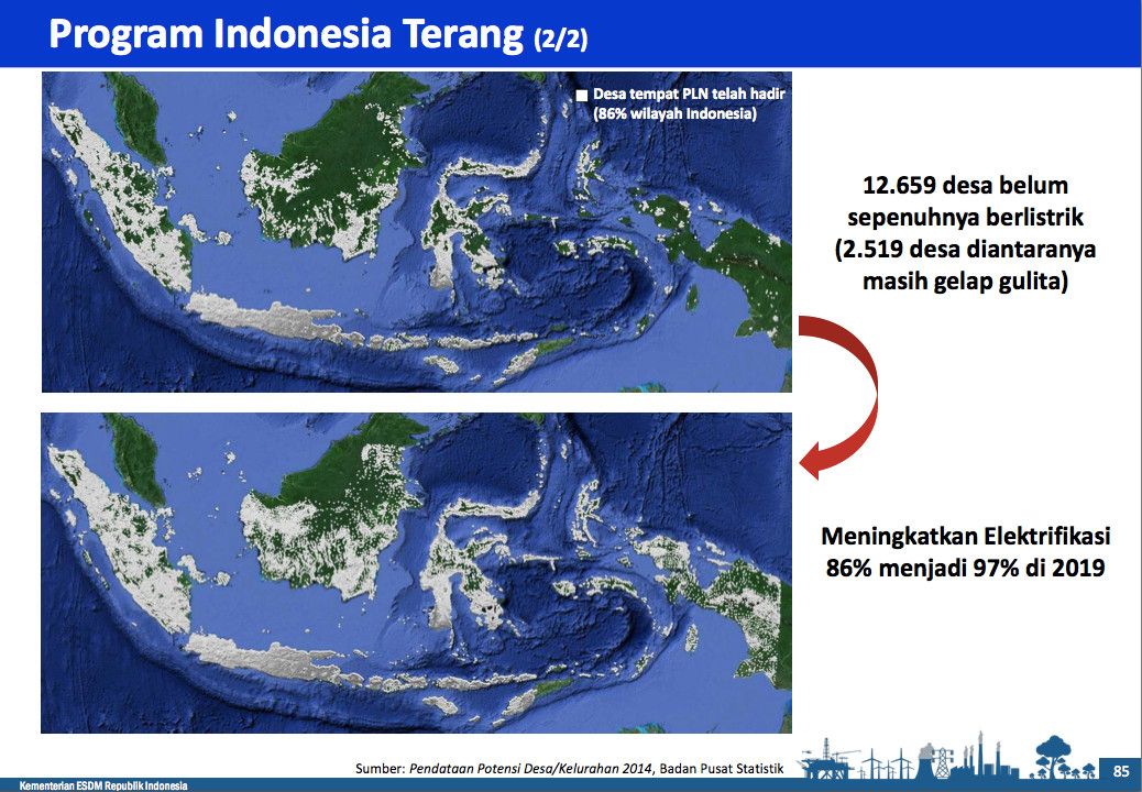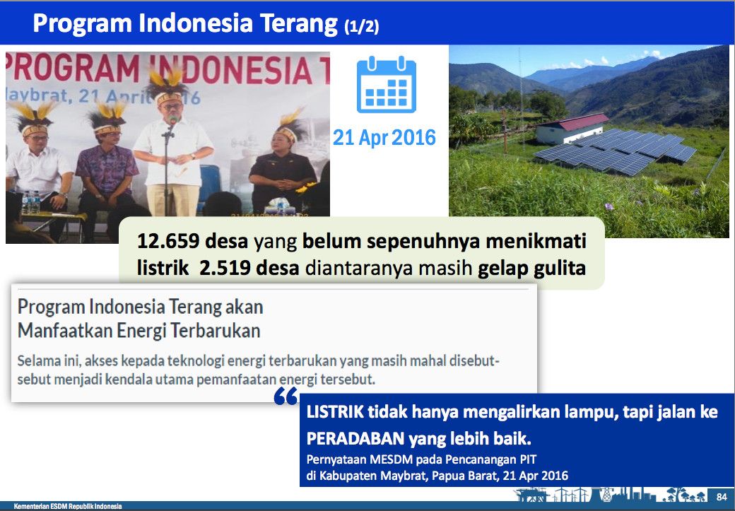 Selain itu, ESDM juga membuat Program Indonesia Terang (PIT). Lewat program ini akan dibangun pembangkit-pembangkit listrik, yang memanfaatkan sumber energi terbarukan, di daerah-daerah terpencil.