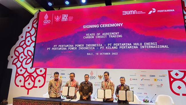 Pertamina menginisiasi pilot project perdagangan karbon yang dilakukan antar subholding, yaitu Pertamina NRE, Subholding Upstream (PHE), dan Subholding Refinery & Petrochemical (KPI). Kolaborasi ketiganya ditandai dengan penandatanganan heads of agreement (HoA) dalam acara G20 State-owned Enterprises International Conference.
