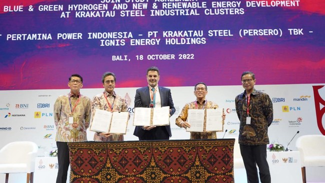 Ketiga perusahaan meneken kerja sama joint study agreement (JSA) tentang Pengembangan Blue & Green Hydrogen serta energi baru terbarukan di Wilayah Industri Krakatau Steel. Kerja sama dilakukan pada sela acara G20 State-Owned Enterprises (SOE) International Conference yang dihelat di Nusa Dua, Bali.