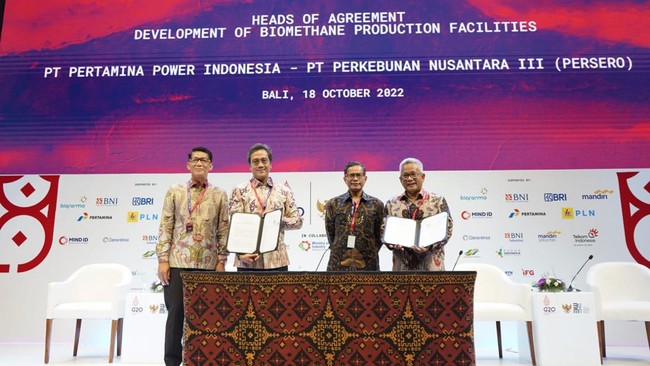Hal ini ditandai dengan penandatanganan kerja sama hulu ke hilir penyediaan Compressed Biomethane antara Pertamina NRE melalui afiliasinya Pertagas Niaga dengan PT Perkebunan Nusantara III (Persero) atau PTPN III dalam acara State-Owned Enterprises International Conference di Nusa Dua, Bali