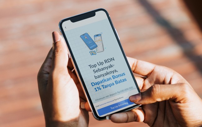 Program yang dimulai sejak 6 Agustus ini menawarkan bonus menarik bagi para investor, yaitu bonus sebesar 1% dari nilai top-up RDN dengan minimum top-up di atas Rp 100 juta.