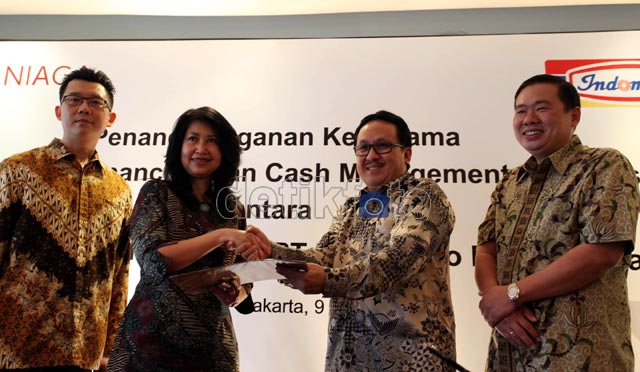 Jakarta - PT Bank CIMB Niaga dan PT Indomarco Prismatama (pengelola jaringan Indomaret) melakukan kerjasama progam pembiayaan waralaba untuk investor Indomaret di Jakarta, Jumat (9/3). Melalui kerjasama ini, CIMB Niaga mewujudkan peran aktifnya dengan tidak hanya menyalurkan pembiayan untuk nasabah korporasi, tetapi juga mendorong pembiayaan untuk nasabah kecil dan menengah.