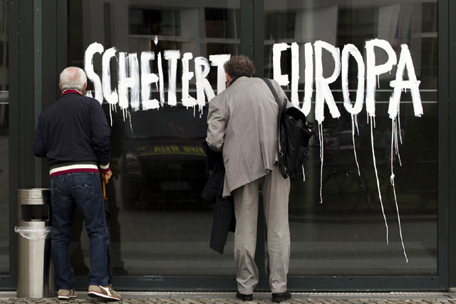 - Para pengunjung Akademi Seni di Berlin melintas di depan grafiti soal krisis euro, Selasa (3/7/2012). Grafiti dalam bahasa Jerman tersebut menyindir krisis Euro yang makin memprihatinkan. 'Bila Euro Gagal, Eropa Gagal'.