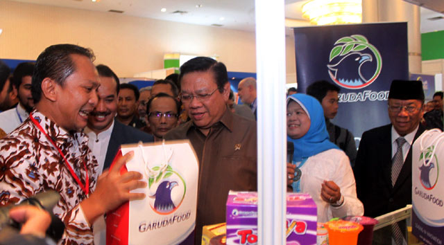 - Menkokesra Agung Laksono meninjau stand GarudaFood dalam acara INDHEX 2012 di Jakarta, Kamis (5/7/2012). GarudaFood Group merupakan salah satu perusahaan makanan dan minuman terdepan di Indonesia yang terus concern dan berkomitment pada kehalalan produk.
