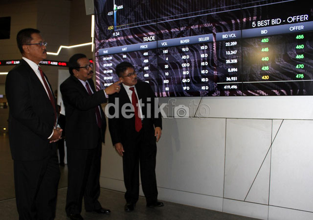 Gubernur Jawa Timur (Jatim) Soekarwo selaku pemilik saham mayoritas PT Bank Jatim Tbk (BJTM) menunjuk perkembangan harga saham Bank Jatim pada 2 jam pertama sempat mencapai Rp 470 dari harga awal Rp 430. Budi Hartadi/detikcom.