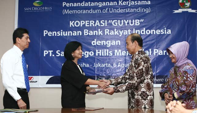 Jakarta - Koperasi Guyub Pensiunan BRI dan San Diego Hills Memorial Park bekerjasama dalam pengadaan kavling makam bagi para pensiunan dan para karyawan aktif, serta keluarga besar BRI di Jakarta, Senin (6/8).