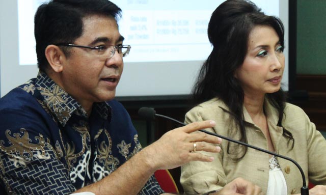 Koordinator Forum Komunikasi Asosiasi Nasional (FORKAN) yang juga Sekretaris Jenderal Gabungan Pengusaha Makanan dan Minuman Indonesia Franky Sibarani (kiri) bersama Ketua Asosiasi Pemilik Merek Lokal Indonesia Putri K Wardani (kanan) memberikan keterangan dalam jumpa pers Forum Komunikasi Asosiasi Nasional di Jakarta.