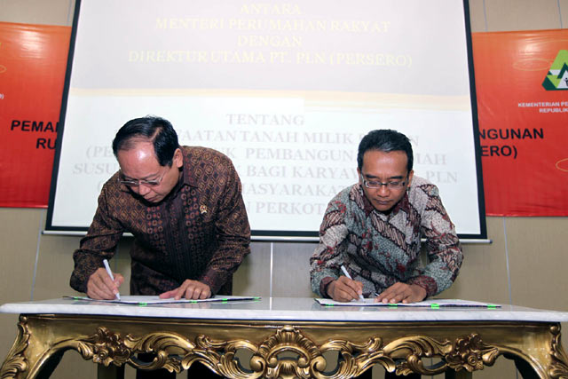 Menteri Perumahan Rakyat Djan Faridz (kiri) dan Direktur Utama PLN Nur Pamudji (kanan) menandatangani kerjasama pembangunan Rumah Susun Umum Milik bagi karyawan PT PLN (Persero) dan masyarakat umum di kawasan perkotaan. (Agus Trimukti/Humas PLN).