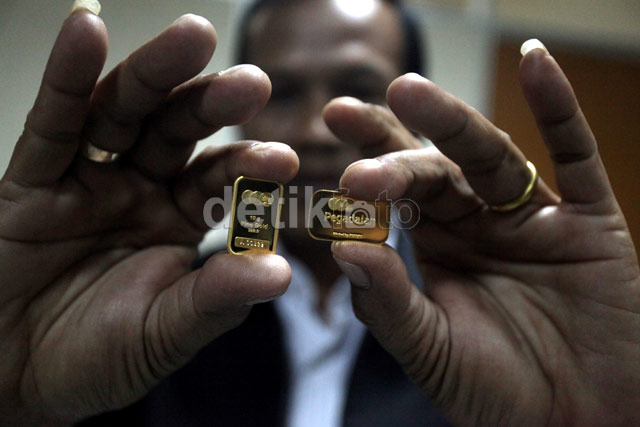 Penjualan Emas Pegadaian Naik 80 % Seorang pegawai menunjukkan emas pegadaian yang dicetak di Perum Peruri, Karawang, Jawa Barat, Senin (24/6/2013). Hingga bulan Mei 2013, penjualan emas PT Pegadain (Persero) telah mencapai Rp 865 miliar. Hingga akhir tahun 2013, Pegadaian menargetkan penjualan emas bisa tembus hingga 4 ton.