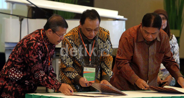 Ketua Umum REI Setyo Maharso (kiri) Dirut BTN Maryono (tengah) dan Direktur Utama PT Taspen (Persero) Iqbal Latanro melakukan penandatangan perjanjian kerjasama. Lamhot Aritonang/detikFoto.
