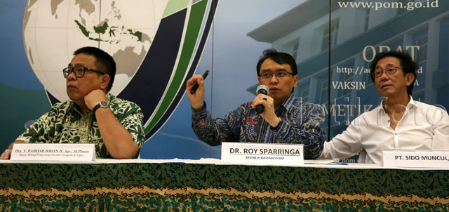 Kepala Badan Pengawas Makanan dan Obat (BPOM) Roy Sparinga bersama Direktur Utama PT Sido Muncul Irwan Hidayat memberikan keterangan pers di Kantor BPOM, Jakarta Pusat, Jum'at (14/8/2015).