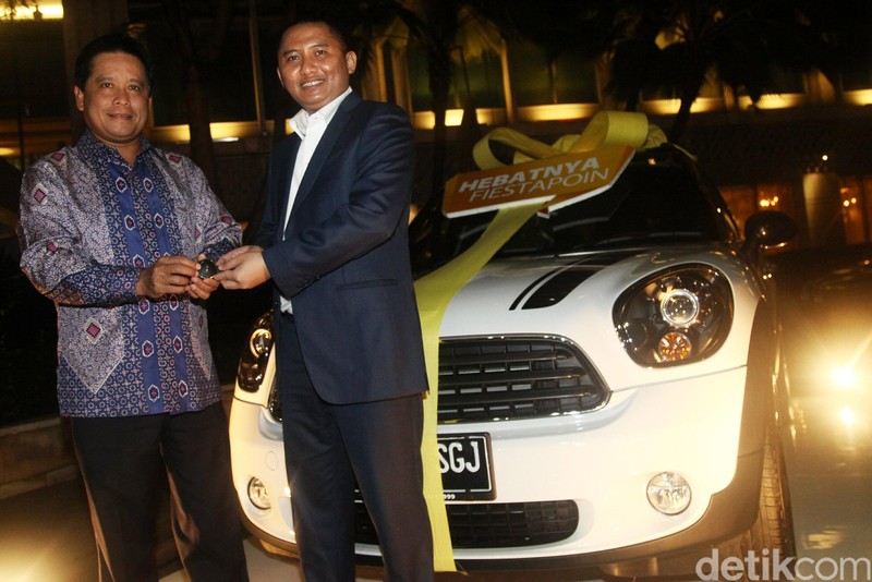 Direktur Consumer Banking Bank Mandiri Hery Gunardi memberikan hadiah utama mobil mini cooper program Fiestapoin Akhir Tahun 2015 kepada nasabah Bank Mandiri Andika Surachman di Jakarta Senin (25/1/2016).