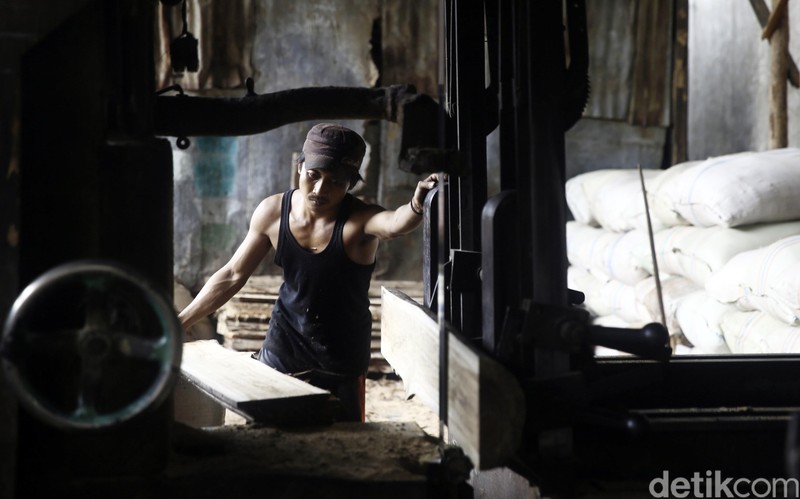 Pekerja memotong kayu gelondongan menjadi kayu lapis untuk bahan baku pembuatan furniture di Jakarta, Selasa (15/3/2016).
