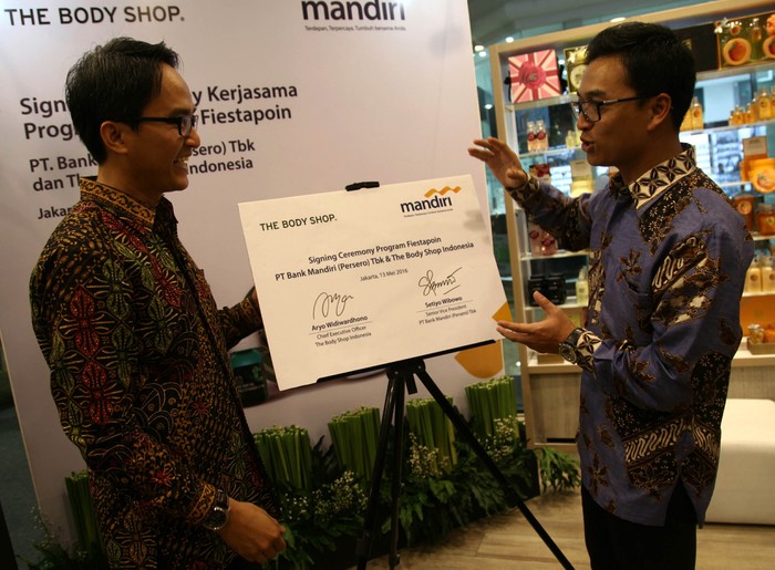 Jakarta - Bank Mandiri menjalin kerjasama dengan The Body Shop Indonesia. Kini pelanggan the body shop dapat melakukan pembayaran dengan berbagai fasilitas Bank Mandiri.