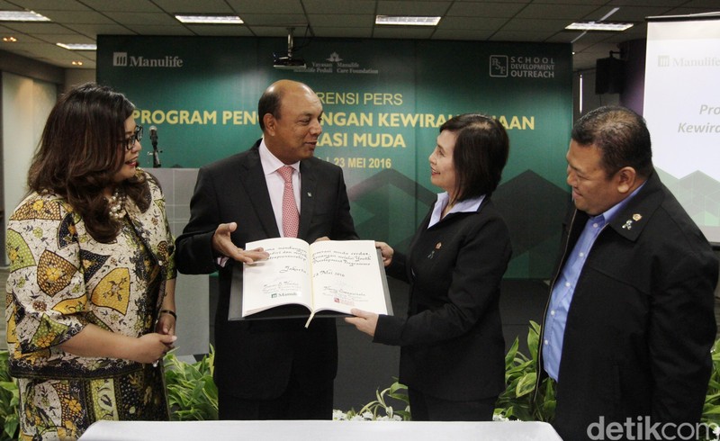 Chief Marketing Officer Manulife Indonesia Novita J Rumngangun, Presiden Direktur & CEO Manulife Indonesia Indren S Naidoo, Managing Director Putera Sampoerna Foundation Nenny Soemawinata dan Head of Putera Sampoerna Foundation School Development Outreach Gusman S Yahya berfoto saat peluncuran Program Pengembangan Wirausaha Muda di Jakarta, Senin (23/5/2016).