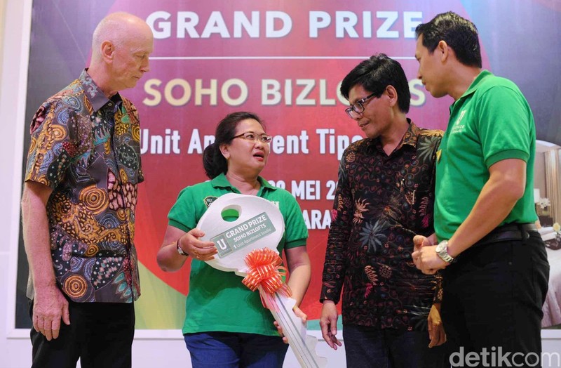 Presiden Direktur PT Supermal Karawaci Joachim Rohn bersama General Manager Marketing U Residence, Machjani Safrudin, Asistant Project Director Djohan Mekuo berbincang dengan perwakilan penerima GRAND PRIZE BIZLOFTS U-RESIDENCE, 1 unit Apartemen tipe studio di Grand Atrium Supermal Karawaci, Tangerang, Banten.