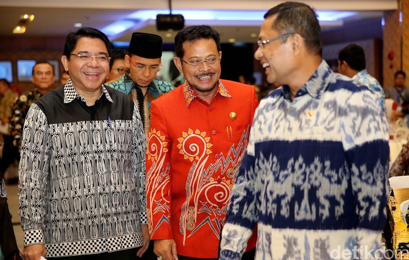 (kiri-kanan) Kepala BKPM Franky Sibarani (kiri) bersama Gubernur Sulawesi Selatan Syahrul Yasin Limpo (tengah) dan Menteri Perindustrian Saleh Husein (kanan) memasuki ruang Nusantara I Gedung BKPM.