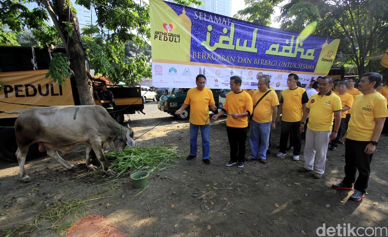 Artha Graha Berkurban Ketua Yayasan Artha Graha Peduli (AGP) Rony Brata Wijaya menyerahkan hewan kurban kepada panitia pelaksana Andreas W. Wisesa. Hewan kurban diturunkan dari truk. Seekor sapi diturunkan dari truk. Tahun ini, AGP menyalurkan hewan kurban ke 263 titik lokasi di seluruh Indonesia.