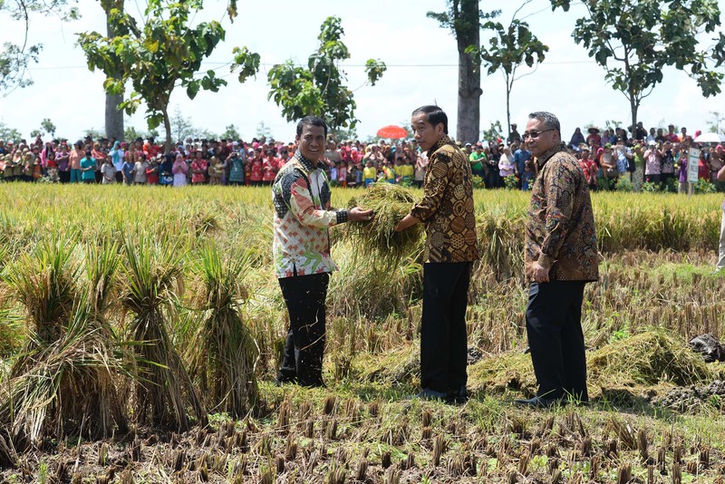 Presiden Joko Widodo didampingi Menteri Pertanian Amran Sulaiman dan Menteri Desa, PDT dan Transmigrasi Eko Sandjojo mengikuti panen raya padi varietas unggul Jajar Legowo Super di Desa Trayu, Kecamatan Banyudono, Kabupaten Boyolali, Jawa Tengah, Sabtu (29/10/2016). Wening/Kemdes PDT.